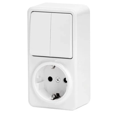 German combination switch and socket, with a 1-way configuration and 2 keys, presented in an elegant white colour. Ideal for unifying functions in tight spaces. Combination switch with 1-way German plug and 2 keys, distinguished by its elegant white colour, ideal to harmonize with all types of interior decorations. 1-way German combination switch and plug with 2 keys, in an elegant white colour, ideal for modernising spaces while maintaining functionality. Combination switch and socket, ideal for optimising space and functionality in any home. White color and elegant design, fits perfectly into modern decor.