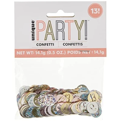 1 Pack Rose Gold 13th Birthday Confetti Pack contains 14g confetti Ideal for decorating tables on a rose gold 13th birthday party Add as a surprise to party invitations, gift baskets or favor bags Combine with other glitter rose gold birthday party materials from Unique Party, Manufacturer: Unique Party