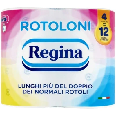 Rotoloni Regina is the white and decorated toilet paper, more than twice as long as normal toilet paper rolls. The package contains 4 rolls of 2-ply toilet paper with 500 tears per roll (tolerance 5±%), and a total length of 61 metres per roll. Rotoloni Regina is a 100% Italian product, created with a selection of pure cellulose that guarantees high quality. Regina toilet paper respects the environment because it is produced exclusively with raw materials from responsibly managed forests and backed by the FSC forest certification. Rotoloni Regina is a Sofidel product, the leading Italian company in the paper sector for hygienic and domestic use, adhering to the WWF Climate Savers initiative since 2008, a programme that aims to reduce greenhouse gas emissions.