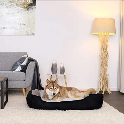 GREAT COMFORT FACTOR. Your four-legged friend will love their new plush dog bed, which is particularly soft and comfy. With its modern design, it will be a real eye-catching addition to your home. 2-IN-1 FEATURE. The dog basket is reversible, and so can be used in two different designs. COMFORTABLE ENTRY. Dogs of all sizes can easily get into their comfortable pet bed, thanks to its low entrance. This adds to their sense of well-being. EASY-CLEAN. This easy-care dog mattress can be washed by hand. WIDE RANGE. To offer you the perfect choice, our soft dog bed is available in various colours and sizes. We offer it here in black-grey colour and size (L) 110x80 cm, please refer to the images for exact dimensions.