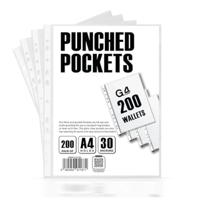A4 punched pockets Frost finish 30 micron polypropylene Reinforced, multi-punched filing strip Pack of 200
