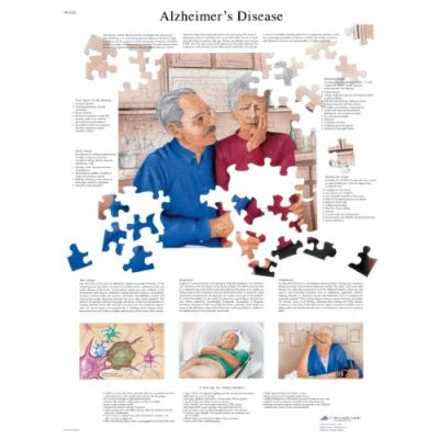 This colourful anatomical poster details Alzheimer's disease The causes, diagnosis, and effects of the disease are discussed on this chart The anatomy poster includes important information about the stages of Alzheimer's and available treatments This thickly laminated anatomical chart is printed on premium glossy (200 g) UV resistant paper The poster comes with 2 sided lamination (75 micron)