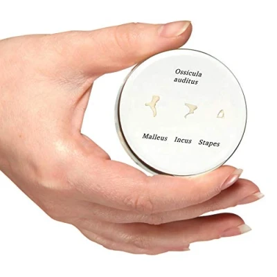 Life-size human auditory ossicles model for anatomical study Individually presented in natural position for detailed examination Natural cast for accurate representation Embedded in durable, transparent acrylic for display