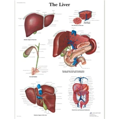 The anatomy of the human liver and its location in the body is detailed in this colourful anatomical chart The anatomy of related organs are displayed along with the liver This poster is a great tool for teaching the role of the liver in the human body Use it in a doctors office or in a classroom This thickly laminated anatomical chart is printed on premium glossy UV resistant paper and comes with 2 sided lamination (75 micron)