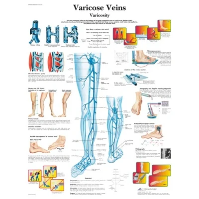 This colourful anatomical chart shows varicose veins in detail The anatomy poster contains information about causes and how to treat varicose veins This thickly laminated anatomical chart is printed on premium glossy UV resistant paper and comes with 2 sided lamination (75 micron) It comes in a convenient poster size 50cm x 67cm (20" x 26'') and can be written on and wiped off with non permanent markers The 75 micron lamination ensures the chart does not curl up at the edges