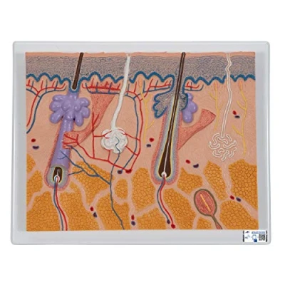 This skin relief model shows a section through the three layers of the hair-covered skin of the head The skin section shows representation of hair follicles with sebaceous glands, sweat glands, receptors, nerves, vessels The skin section portrays the anatomy of the skin at 70 times life size The skin model is delivered on base Measures 10.2 x 13.0 x 2.0 inches (H x W x D) 5 years warranty Free access to the exclusive virtual anatomy content of 3B Smart Anatomy. You can now learn all about anatomy online with the virtual version of your model. Download the new and free 3B Smart Anatomy app and start right away to test your knowledge, display your very own AR (Augmented Reality) model, and use the anatomical structure hotspots to study in detail.