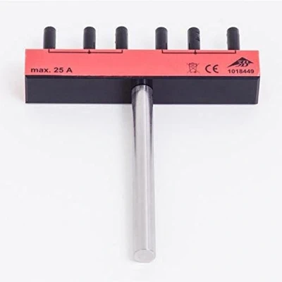 Max. continuous current: 25 A Diameter of rod: 10 mm Dimensions: 110x20x135 mm Weight: 120 g Suitable for both 4-mm laminated plugs as well as 4-mm safety plugs
