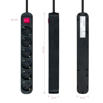 6-outlet power strip with switch, perfect for those who need to connect multiple devices. Its 1.4m cable offers flexibility in location, while its black design blends easily into any environment. Ensures a secure and tidy connection, ideal for offices or homes. 6-outlet power strip with switch, perfect for organizing and connecting up to six devices at once. Its 1.4m cable provides the flexibility to reach distant places, keeping everything in place and ensuring efficient energy use. Its sleek black color suits any environment, making it a stylish and functional option. 6 outlet power strip with switch, perfect for organizing your workspace. With a 1.4m cable, it offers flexibility when connecting multiple devices simultaneously. Its sleek black color suits any environment, providing both functionality and style. Keep everything in order and easily access your electrical appliances with this useful power strip. 6-outlet power strip with switch, a 1.4m cable offers versatility and convenience when connecting multiple devices. Its black design makes it discreet and perfect for any environment. Ideal for those looking for a practical and safe solution for the home or office. The presence of the switch provides simple control over the electrical supply, ensuring efficiency and safety in daily use. 6 outlet power strip with switch, ideal for total control of your power. Its 1.4m cable allows you to conveniently locate it anywhere in the room, allowing you to connect multiple devices safely and neatly, while its sleek black color fits any environment.