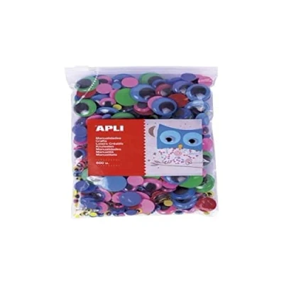 Adhesive mobile eyes in MAXI format ideal for schools and workshops Presentation in zip bag with improved closure. Round, assorted sizes and colours: green, blue, red, pink and yellow. Each bag contains 600 eyes of different dimensions: 6, 8, 10, 15, 20 and 25 mm in diameter.