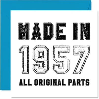 MAKE THEM LAUGH WITH THIS FUNNY BIRTHDAY CARD: This exceptional quality birthday card for her or him shows the design ''Made in 1957 All Original Parts''. If you are looking for funny birthday cards for women, then then this happy birthday card is bound to make them laugh. Not just for friendship gifts for women this could also be for Mum, Grandma, Nan, Dad, Grandad, Nanny, Colleague, Friend, Brother, Sister, Cousin, Son, Daughter, Grandson, Granddaughter, Auntie or Uncle. WHAT DO YOU GET: The card is printed on one side and BLANK ON THE INSIDE to allow you to write your very own message. The unique fun design is printed on a specially sourced and environmentally responsible board. At 360 microns thick the natural white one-sided gloss board has a quality look and feel. Supplied with a coloured gummed envelope to complement the design and ready to be sealed and sent in the post. NO INK SMUDGES: There is nothing worse than writing inside a card to find that the shiny surface makes the ink smudge. This is why we use a high quality one sided coated board. The uncoated side will absorb more of the ink from your pen to make smudging a thing of the past. 68th birthday card funny, happy birthday Dad cards, 68th birthday cards for men. 68th Birthday card for Grandad, retirement card, female birthday cards. SIZES: Greeting Card = 145mm x 145mm, Envelope = 155mm x 155mm, Card Thickness = 360 micron. Great Grandma or Nan birthday cards from Grandson or Granddaughter.Nan 68th birthday card, birthday cards for Dad, rude birthday cards for men, 68th birthday card Mum, Nanny 68th birthday card. MADE AND QUALITY CHECKED IN THE UK: We print and manufacture all our product right her in the UK so you can be sure of a fast turnaround and a product that is expertly made. Using environmentally responsible premium board our card is conscious of the responsible management of the world''s forests - rude birthday cards for women, funny birthday cards for her, Auntie 68th birthday cards, Uncle 68th birthday cards, funny male birthday cards.