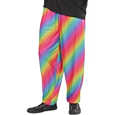 These baggy pants in rainbow colour elastic at the waist will suit a man wearing a size M or L (40 to 44). An original crossover for a colourful and delusionous party or party., Manufacturer: Widmann