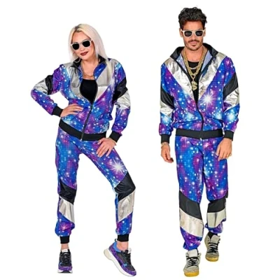 With this costume set from Widmann, you can transform yourself into a funky disco jogger from the 80s The set consists of a jacket with practical zip and trousers, which are equipped with an elastic band Both costume elements are visually reminiscent of a radiant disco ball. A special eye-catcher are the metallised stripes in the colour silver You will receive the 80s style tracksuit in size S. This is suitable for men and women alike More beautiful costumes and accessories can be found in our brand shop. Click on the brand name Widmann below the product title, Manufacturer: W WIDMANN MILANO Party Fashion