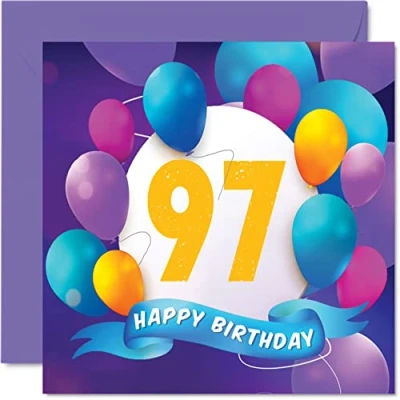 97th Birthday Card for Men Women Balloon Party Happy Cards 97 Year Old Man Woman Great Grandad Grandpa Grandma Gran Nan Nanny Mum Dad, 145mm x Bday Greeting Gift
