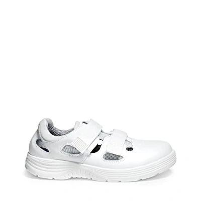 size 14 Smooth leather white with breathable air mesh textile inserts Certification: CE, EN ISO 20345: 2012 S1, SRC Double Velcro closure Non-slip PU outsole