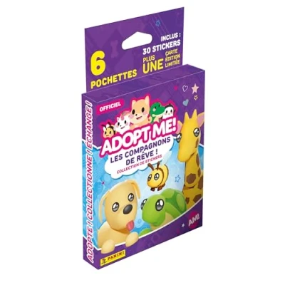 Immerse yourself in the magical universe of Roblox Adopt Me game! with this unique collection that will delight fans and collectors. Blister pack consisting of 6 sleeves of 5 stickers (i.e. 30 stickers) and 1 limited edition card between no. 3, 4, 5 With 128 basic stickers and 48 specials that offer your favorite pets, iconic characters and iconic game locations, but also limited edition cards, this collection promises you a total immersion in your virtual adventure., Manufacturer: Panini