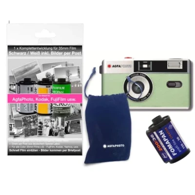 AgfaPhoto Analogue 35 mm Photo Camera in Complete Set: Film + Battery Development Kit for up to 36 Black/White/Images (by Post)