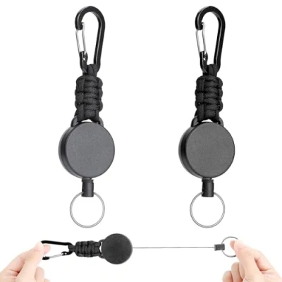 HIGHLY ELASTIC STEEL CABLE - Each retractable badge holder is equipped with a 60cm long and 1mm thick retractable steel cable. The sturdy springs can withstand loads of up to 550 lbs. Strong and Durable: This extendable badge holder is a metal carabiner with anti-corrosion coating and a tear-resistant parachute cord braided section, lightweight and suitable for outdoor use. Emergency Use: This retractable keychain is suitable for all kinds of survival activities, you can also detach the keychain at the time you need, it can be used to pull a car, rock climbing and so on. Wide Range of Applications: Extendable keychain can be used in office, home and outdoor activities, such as hiking, climbing, fishing and so on. You can hang your ID card, access card, key, wrench, etc. Easy to carry: The carabiner keychain can be easily hung on clothes, belts, bags or backpacks.