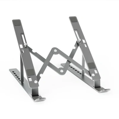 Adjustable desktop stand for laptop or tablet. This stand is fully foldable and super compact. It can be easily stored in a backpack, purse or suitcase when traveling and save space. It offers a total of 7 height options, which helps correct your posture and reduce back pain, neck stiffness, wrist aches and eye strain. Very ergonomic and comfortable for reading and writing. The non-slip silicone feet protect your device from possible scratches and sliding, and the bottom non-slip pads prevent the holder from sliding on most slippery surfaces. Made with a sturdy aluminum alloy, the top can support a maximum weight of 3kg