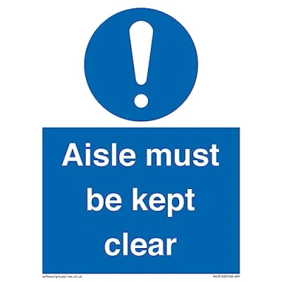 M001 : General mandatory action This sign is made from vinyl / sticker Air Release vinyl makes it easy to stick to flat, clean surfaces without bubbles. Not for rough, plastic or dusty surfaces. A5 portrait Sign Text: Aisle Must Be Kept Clear