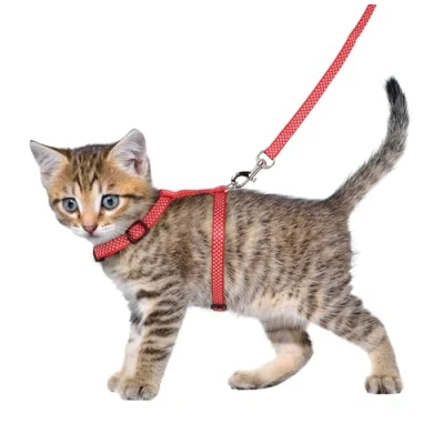 Material: Nylon The harness is infinitely adjustable The harness has a click buckle and the leash has a carabiner Made in China With ring for attaching a leash