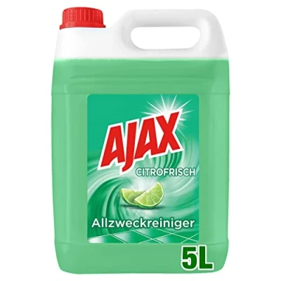 Order this Ajax all-purpose cleaner to easily clean all kinds of surfaces in the house. The product has a degreasing effect and removes almost all contaminants. Because it is also pH neutral, you can use it on all kinds of surfaces, including delicate materials.The formula is more than 94% biodegradable and 100% vegan. This means that you damage the environment as little as possible with this all-purpose cleaner. Because the jerry can is also made of 100% recyclable plastic, this is even more sustainable.You can use this all-purpose cleaner diluted, for example to clean large surfaces, or undiluted to remove stubborn stains. After cleaning, the fresh scent of lime remains, giving you an extra clean feeling. The large bottle has a capacity of 5 litres
