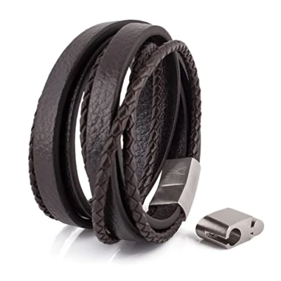 100% Faux Leather and Risk Free Purchase: High quality wide synthetic leather bracelet for men with a magnetic stainless steel clasp. If you don't like it, you have the option of free return for 30 days. Elegant and with a clear conscience: this classic bracelet for men and women is an absolute must-have for any jewellery collection. With a weight of approx. 50 grams, the bracelet is a beautiful accessory that fits any wardrobe. Animal welfare is important to us, so we only use faux leather for the production and even the glue is without animal products (rubber tree) - so the bracelet is also suitable for vegans who value a world without animal suffering. Akitsune works sustainably. Our focus is on durable, timeless and stylish products. These are already climate-neutral by compensation via our partners. We are constantly working to further optimise production and organisation to make our products as climate-friendly and environmentally friendly as possible. Our lovingly designed minimalist design stands for individuality and elegance. The perfect companion to complete your outfit. 🎁 THE PERFECT GIFT: Are you looking for a special and personal gift? Whether for your wife, girlfriend, sister, mum or daughter or your husband, boyfriend or brother; for birthday, anniversary, wedding anniversary, Valentine's Day, Mother's Day, Christmas or Easter. This beautiful piece of jewellery comes in a beautiful box and is the special gift, which is guaranteed to provide positive surprises! Choice of sizes: the bracelet is available in 4 sizes - 17 cm, 19 cm, 21 cm and 23 cm total length are available. You can find your suitable size using the size chart in the pictures or measure your wrist circumference and add +1.5/2 cm for a normal/tight fit or +2/2.5 cm for a relaxed fit. An additional extension piece (+ 1.50 cm is included). Please avoid contact with water for a long service life of the bracelet.