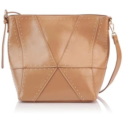 Spacious shoulder bag Made of high quality faux leather Decorated with gold studs Adjustable shoulder strap Textile inner lining