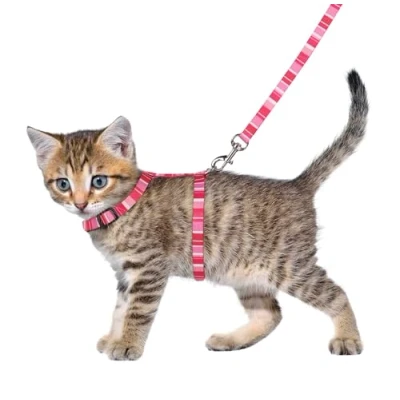 Material: Nylon The harness is infinitely adjustable The harness has a click buckle and the leash has a carabiner Made in China With ring for attaching a leash