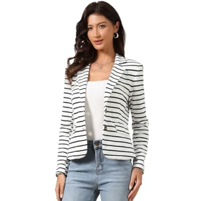 Allegra K Women's Notched Lapel Pocket Button Closure Striped Blazer Medium White
