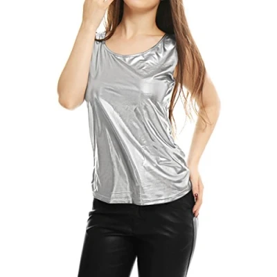 U Neck, Metallic, Tank Top Sleeveless, Stretchy Occasion: Halloween Party, Christmas Party, Wednesday Party, Club, Beach, Weekend Gathering, Casual, etc Hand Wash Cold and Warm Iron; Do Not Machine Wash Model Body Size: Height: 5ft 4inches, Chest: 31 7/8inches, Waist: 24inches, Hip: 35 7/8inches, model is wearing a X-Small