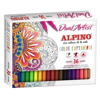 Dual tip pens - 0.7mm fine tip for contouring, writing, or detailing and 2.9mm brush tip for painting or labeling. The professional Alpino Color Experience Dual Artist markers are extremely versatile with 36 different colors. The ink is water-based. Paint in mandalas - They are ideal as a marker for coloring mandalas due to their wide range of vibrant colors. Thanks to their double tip, they can also produce fine, medium, or broad strokes Ideal for lettering - With this brush tip and fine tip markers, you can practice lettering and techniques. Especially thanks to its flexible brush tip Ergonomic markers - Thanks to its triangular barrel, Alpino Color Experience Dual Artist Markers sit comfortably in your hand and are convenient to use when colouring
