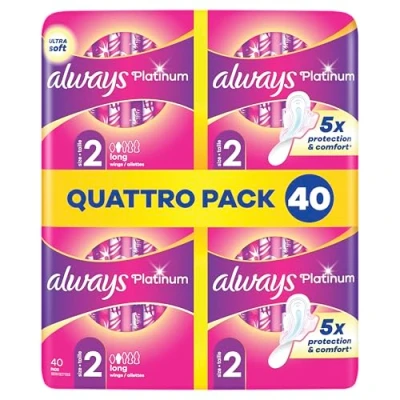 Neutralize odors and give you a fresh feeling and confidence all day long Panty liners with thin and discreet design for extra comfort 2-in-1 soft top layer for extra absorption, comfort and softness Breathable design that offers you optimal protection This product contains 1x Always - 40x Platinum Bandage Long + QP - 1 Piece