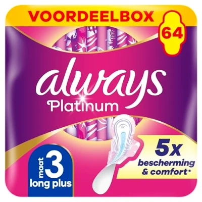 Always Platinum Sanitary Napkins, Size 3, Day & Night, 64 Towels with Wings, Abundant Flow and Eco Size, Soft Flexible, Super Absorbent Ultra Thin