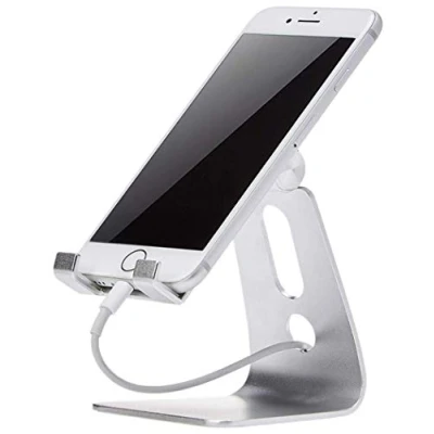 Works with iPhone and Android devices; fits devices measuring 4 to 8 inches (10 to 20 cm) Multi-angle design?can be adjusted up to 270 degrees; holds phones vertically or horizontally for portrait or landscape view Durable aluminium body with a modern silver finish; lightweight; rubber pads for non-slip use; hole for charging cable Measures 8.12 by 7.62 by 9.9 cm International products have separate terms, are sold from abroad and may differ from local products, including fit, age ratings, and language of product, labeling or instructions.