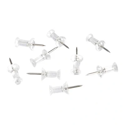 Push pins (200-count) for fastening papers, photos, and more to bulletin boards, including cork boards, foam boards, or paper boards Standard size with a strong 9 mm ground steel point and a 13 mm plastic head for easy insert and removal Clear plastic heads offer an inconspicuous professional appearance Clear container included for keeping the push pins neatly stored and easy to access Ideal for office, home, or classroom