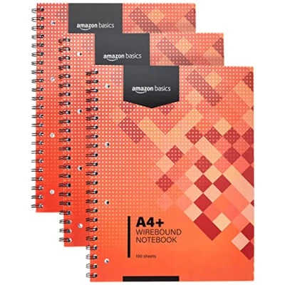 Amazon Basics Wirebound Notebook, 100 Sheets, 200 Pages A4+, 80GSM, red, Pack of 3