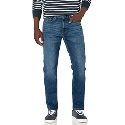 ATHLETIC FIT: Extra room in the hip and thigh, tapered calf and ankle. Sits at the waist. Built to fit like a straight jean on an athletic body LIGHT-STRETCH DENIM: Mid-weight cotton denim with a bit of stretch for all-day comfort. Comes in indigo denim washes or solid colors with a garment wash for a lived in denim-inspired look. ATHLETIC-FIT JEAN: These classic, five-pocket jeans are a wardrobe workhorse, perfect for business casual or everyday on-the-go. DETAILS: Features zippered fly with metal button fly closure, bartack reinforcements, and rivets at front hand pockets. With stretch denim, it is always recommended to hang to dry for an extended garment life. LEG OPENING: 7 1/2" on US size 32