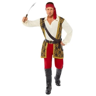 MENS Pirate fancy dress Set includes Top, Trousers, Shoulder strap, Belt and Headscarf Perfect for stag parties, everyday fancy dress, Halloween and more