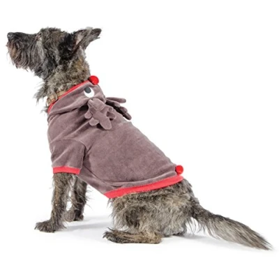 Gives your dog a fun look this christmas This suit is also practical as it provides warmth This cute outfit comes with eyes, ears, antlers and a red pom-pom nose. Made from a soft brown material with red cuffs and hem. Adorable little suit for your furry friend over the festive season.