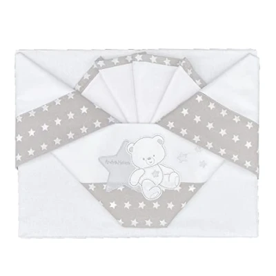 Set of 3 under-top-cushion cover for bed sheet pram/crib colour: grey. Dimensions: 110 x 80 - 100 x 50 - 37 x 28 cm - Universal sizes suitable for all prams and small cots. No cribs next to me The Andy & Helen Crib Sheet Set is made with the finest quality cotton for comfort and a peaceful sleep from the very first days. Consists of top sheet with embroidery in the middle + bottom with elastic bands to fit perfectly on the mattress + pillow case. The teddy bear pattern gives the bedroom a delicate and colourful touch thanks to the frill with stars. Easy to match with other duvets and blankets. The set is made entirely in Italy with Italian cotton to preserve the quality of Made in Italy that distinguishes us. The fitted sheet has a size that only fits mini cribs and prams. Measurements: top sheet 110 x 80 cm - bottom sheet 35/43 to 70/82 Not suitable for maxi cots/side bed