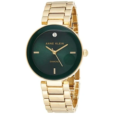 Slightly domed wall-to-wall mineral crystal lens Green sunray dial with genuine diamond at 12; gold-tone hands and markers Gold-tone adjustable link bracelet; jewelry clasp and extender Water resistant to 100 feet (30M)