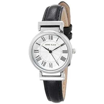 Slightly domed mineral crystal lens Silver-tone textured dial with black hands and Roman numerals; printed inner minute track Black leather strap with buckle closure Water resistant to 100 feet (30M)