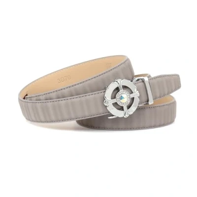 Workmanship: the strap is sewn together from two parts. The upper part is 100% leather in 3D embossing, the lower part is high-quality, pleasantly soft, durable and environmentally friendly faux leather. The belt strap is 2.5 cm wide and 4.0 mm thick. The white back is also suitable for light trousers. In the middle is the brand name "Anthoni Crown". Can be shortened individually: a belt with automatic buckle can be easily shortened in just 4 steps: 1. Open the clamp on the back of the buckle with a screwdriver or knife and pull out the belt. 2. Measure and mark the length by which the belt needs to be shortened. 3. Carefully cut the piece along the line with scissors or a sharp knife. 4. Insert the belt into the buckle and close the clamp. Gift idea and Packaging: belt comes in an original Anthoni Crown gift fabric bag. Ideal gift for mother, grandma, daughter, sister or colleague if the belt length is unknown. Stylish and vill-sided: urban belts in grey with automatic clasp set stylish accents and depending on the occasion can be worn with a suit or favourite jeans. The silver buckle is nickel safe and has a clamp closure. The white back is also suitable for light trousers. Correct size: the sizes shown are the waistbands. The waist size corresponds to half the body circumference at the waist height, where the belt should sit later. The total length of the belt is always approx. 10 cm longer than the waistband. If you are in between, we recommend choosing the larger belt size for the Anthoni Crown belt.