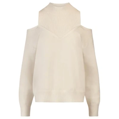 Trendy shoulder cut-outs Ribbed front and collar insert Soft fine knit quality Straight, comfortable fit Ribbed cuffs on hem and sleeves