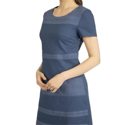 Straight cut, slightly tailored at the back Round neckline Short sleeves Broderie stripe at front Side zip on the left side