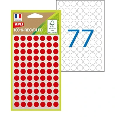 Pack of 462 red permanent adhesive dots. Diameter: 8 mm. Recycled labels made from 100% recycled FSC certified paper. 100% non-polluting water-based acrylic adhesive. 100% recyclable film. Round coloured dots for marking documents, schedules, inventory, products or craft projects Hand writing.
