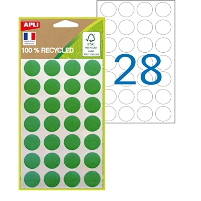 Pack of 168 green coloured dots with permanent adhesive. Diameter: 15 mm. Recycled labels made from 100% recycled FSC certified paper. 100% non-polluting water-based acrylic adhesive. 100% recyclable film. Round coloured dots for marking documents, schedules, inventory, products or craft projects Hand writing.