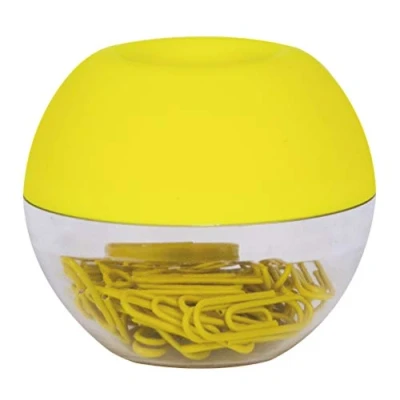 Clip dispenser size Ø 70 x 60 mm in yellow. Two-piece dispenser: transparent base and colour magnetic lid with "soft touch" finish. Ideal for home, office or school. Includes 50 x 28mm Fluorescent Yellow Clips