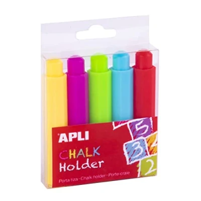 Pack of chalk holders to hold classic round chalks of 9 mm in diameter and prevent breakage. INCLUDES 5 different coloured chalk holders: yellow, fuchsia, green, turquoise blue and red. PERFECT for adjusting the length of the chalk, having greater accuracy and not getting dirty hands. RECOMMENDED for both school and home. Useful for facilitating teacher and student writing and recommended for children with sensitive skin. Avoid contact of chalk with your hands