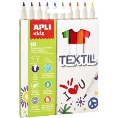 Pack of 10 textile felt tip pens, size 11 x 137 mm in assorted colours: black, brown, purple, dark blue, sky blue, green, red, orange, salmon and yellow 2.9mm round barrel felt tip pens with blocked rounded tip The APLI Kids felt tip pens feature a cap with protection against suffocation, are non-toxic, gluten free and their ink is durable. Allow to dry for at least 24 hours after use: wash-resistant (cold, temperature. : max. 30ºC). Ideal for all types of fabrics. Recommendation: For best results, the colours can be fixed by ironing once the ink has dried. For children over 3 years: to be used under adult supervision, Manufacturer: Apli